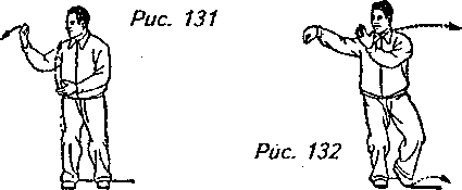 Движение 1 (продолжает рис. 130): Поднимите правую ладонь по кривой вправо, соединяя пальцы вместе, чтобы образовалось подобие клюва; опустите левую руку, пронося ее перед животом, и поднимайте ее до тех пор, пока она не окажется перед правым плечом, ладонью к телу. Выполняя эту часть упражнения, перенесите центр тяжести на правую ногу, и приставьте левую ступню к правой, не отрывая кончиков пальцев от земли. Взгляд должен быть обращен в сторону левой ладони (рис. 131, 132).