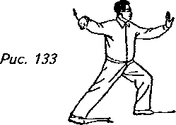 Движение 2: Поверните верхнюю часть корпуса немного влево, сделайте левой ногой один шаг вперед и влево, перенося на нее вес своего тела и переходя на левый “шаг вдоль кромки радуги”. Выполняя эту часть упражнения, поверните левую ладонь от себя и вытолкните ее от себя влево, держа пальцы на уровне глаз. Обе руки нужно немного согнуть в локтях, чтобы и они, и плечи слегка провисли. Взгляд направлен на левую ладонь (рис. 133).