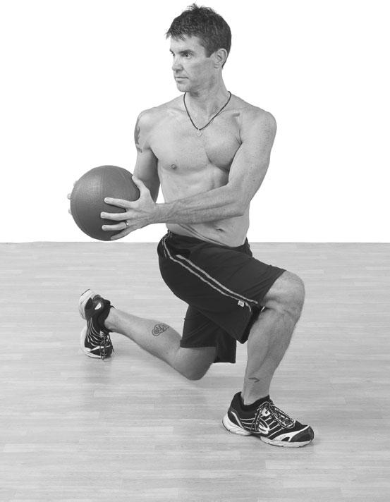 2. Удерживая мяч прямо перед собой, сделайте шаг вперед (или назад) правой ногой и начните переходить в выпад. Опуская бедра, поверните корпус и переместите мяч направо, чтобы в итоге корпус развернулся под углом 90 градусов к исходному положению обе ноги согнулись в коленях под углом 90 градусов, а руки выпрямились.