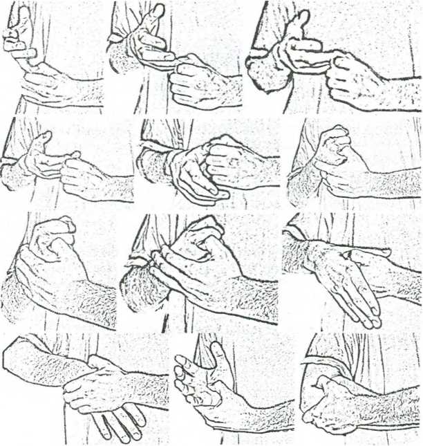 Массаж начинается с кончика мизинца. Далее последовательно массируются все пальцы вплоть до большого. Затем точки между основаниями первых фаланг пальцев, также начиная с мизинца и до точки Хэ-гу у основания большого пальца. Следующая точка Лао-гун в основании ладони. Далее одновременно массируются две точки на лучезапястном суставе. И последняя точка на локтевого сустава.