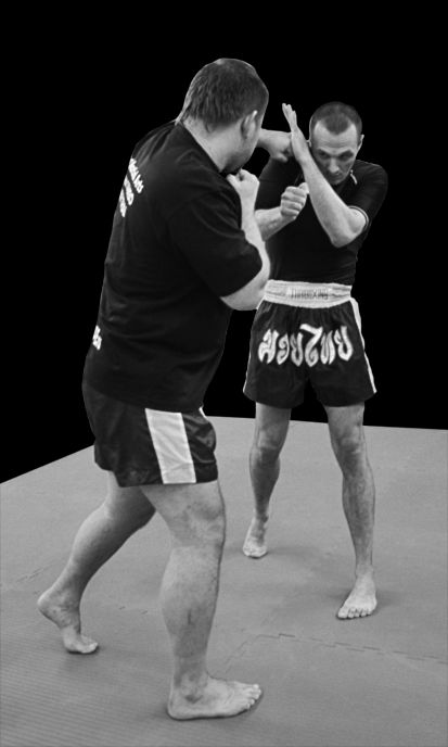 Блокирование бокового удара в голову подставкой ладони — противник атакует боковым ударом в голову. Быстро вскидываем навстречу удару ладонь одноименной руки и прячем челюсть за плечом (рис. 235, 236). Ладонь, блокирующая удар, должна стоять железобетонно, так, чтобы мощный боковой не продавил вашу защиту.