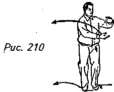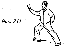 Движение 1 (продолжает рис. 209): Немного поверните корпус влево, возвращая левую руку так, чтобы ладонь, обращенная вниз, оказалась перед грудью, а правую ладонь разожмите и передвиньте вниз и вправо, чтобы она с поверхностью, направленной вверх, оказалась под левой и чтобы обе ладони заняли положение “обхватывания мяча”. Одновременно с этим придвиньте правую ступню к внутренней стороне левой стопы, касаясь носком земли. Взгляд обращен на левую ладонь (рис. 210).