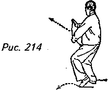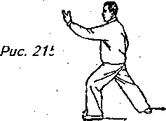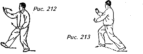 Движение 3: Отведите верхнюю часть корпуса немного назад, чтобы перенести вес тела на левую ногу, и поверните правый носок чуть наружу. Затем поверните корпус вправо и перенесите центр тяжести на правую ногу, переходя на правый “шаг вдоль кромки радуги”. Одновременно с этим отведите правую руку назад, чтобы она оказалась перед грудью ладонью вниз, а левую руку переместите перед животом вправо, чтобы она оказалась под правой рукой ладонью вверх; то есть руки должны оказаться в положении “обхватывания мяча”. Выполняя эту часть упражнения, приблизьте левую ногу к внутренней стороне правой ступни, носком касаясь земли. Взгляд направлен на правую руку (рис. 212, 213, 214).