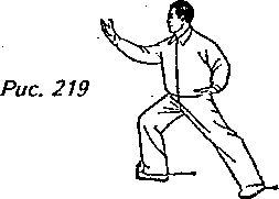 Движение 6: Сделайте правой ногой шаг вправо и перенесите вес тела на нее, образуя правый шаг "вдоль кромки радуги”. Одновременно с этим разведите обе руки в стороны: правую руку с ладонью, направленной под углом вверх, переведите вправо и вверх до уровня глаз, а левую (с ладонью вниз) опустите до левого бедра. Взгляд обращен в сторону правой ладони (рис. 219).