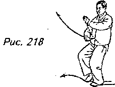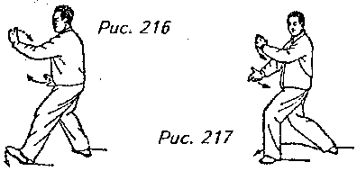 Движение 5: Отведите верхнюю часть корпуса немного назад, чтобы перенести вес тела на правую ногу, и поверните левый носок чуть наружу. Затем поверните корпус влево и перенесите центр тяжести на левую ногу, переходя на левый “шаг вдоль кромки радуги”. Одновременно с этим отведите левую руку назад, чтобы она оказалась перед грудью ладонью вниз, а правую руку переместите перед животом влево, чтобы она оказалась под левой рукой ладонью вверх, то есть руки должны оказаться в положении “обхватывания мяча”. Выполняя эту часть упражнения приблизьте правую ногу к внутренней стороне левой ступни, носком касаясь земли. Взгляд направлен на левую руку (рис. 216, 217, 218).
