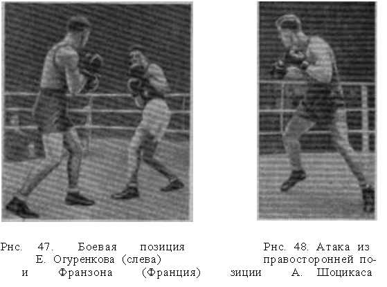 Опишем боевые позиции, наиболее часто применяемые мастерами. Самой характерной, наиболее типичной позицией, которую можно было бы назвать и «основной», была позиция заслуженного мастера спорта Е. Огуренкова. Эта позиция относительно закрыта (более, чем другие виды позиций), боксер в ней стоит, сильно развернувшись левым плечом вперед, причем левое плечо значительно приподнято.