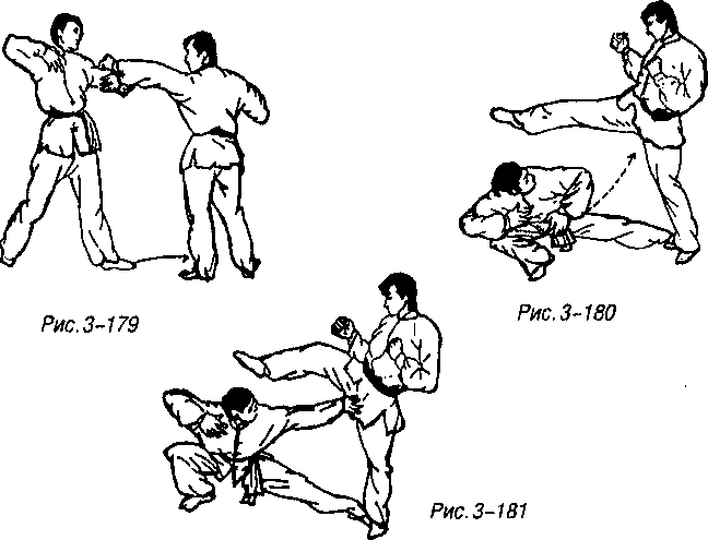 Из позиции для атаки швыряемой ладонью, когда противник левым кулаком проводит ложную атаку мне в голову, я чуть смещаю вес тела назад (рис. 3-179).