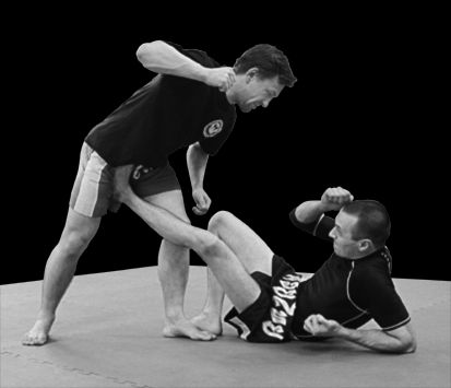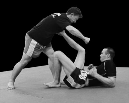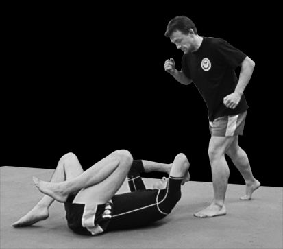 Если в процессе боя вас сбили на землю, то весьма эффективными могут быть мощные удары ногами снизу, особенно если ваших противников несколько и вам нельзя ввязываться в борьбу. Лежа на спине, у вас будет довольно устойчивое положение, пользуясь которым, можно наносить довольно быстрые и болезненные удары по ногам и в живот вашим противникам. Помните, что, когда вас стараются забить ногами на земле, недостаточно просто свернуться в позу зародыша и пытаться прикрыть руками голову, чтобы меньше досталось. Если ваши противники реально хотят вас покалечить, они пробьют ногами, обутыми в ботинки, любые ваши подставки, и тогда вам конец. Наоборот, оказавшись на земле, нужно вести себя очень активно, необходимо агрессивно бить ногами, крутиться, подставляя под удары противников локти и стопы, и пытаться любой ценой встать на ноги. Потренируйте быстрые подъемы из позиции лежа на спине обратно на ноги, не используя при этом опору на руки, которыми в этот момент лучше прикрывать голову. На рис. 521—525 приведены некоторые примеры ударов ногами снизу по атакующему вас противнику. Что бы ни случилось, не сдавайтесь и сопротивляйтесь до конца, и тогда у вас будет шанс выбраться из этой весьма опасной ситуации.