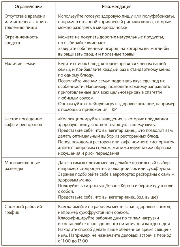 Среди главных ограничений, которые мешают придерживаться здорового питания, — нелюбовь к готовке, отсутствие времени на нее, ограниченность средств, наличие семьи, частые посещения ресторанов и кафе, многочисленные разъезды или сложный рабочий график. В таблице 7.1 есть советы по преодолению всех этих трудностей.