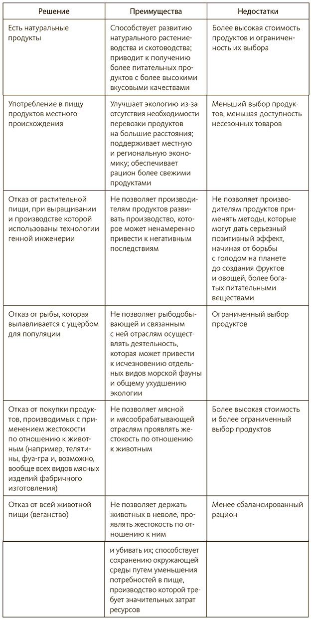 В таблице 7.2 приведены примеры преимуществ и недостатков тех потребительских решений, которые основываются на нравственных нормах и моральных ценностях. Она поможет вам сделать выбор.