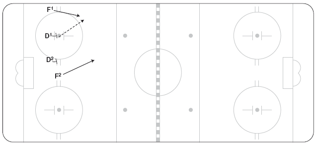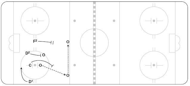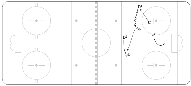 Центральный нападающий вступает в борьбу, чтобы вырваться и начать прессинг защищающихся игроков на сильном фланге. Если защитник передал шайбу коллеге по амплуа, то F2 выходит на линию броска. D1 берет на себя противостоящего центрфорварда, а D2 – находящегося внутри площадки нападающего. Такая расстановка более традиционна для использования командами в зоне защиты, однако при ее реализации центральному нападающему бывает сложно освободиться.