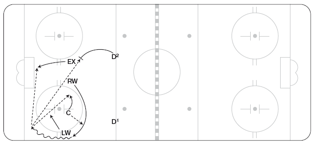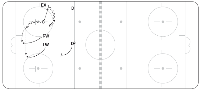 Двое нападающих занимают позиции внутри площадки (рисунок 11.40), а один – у борта (этот игрок должен быть левшой). C может отбросить шайбу к борту, рассчитывая на быстрый бросок EX (дополнительный нападающий), также центральный нападающий имеет вариант подтолкнуть шайбу вперед и быстро отправить ее к воротам, где находятся LW и RW.