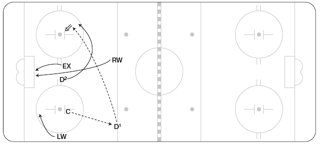 RW возвращается, чтобы помочь на вбрасывании, D1 находится с внутренней стороны круга (рисунок 11.39). C отдает шайбу назад D1. EX (дополнительный форвард) направляется к воротам. D2 совершает скольжение и готовится к броску в одно касание (в этом примере D2 – левша). D1 может совершить бросок по воротам или отдать пас D2, чтобы тот выполнил быстрый выстрел.