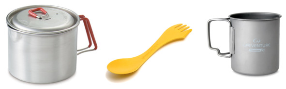 С этим всё очень просто – что возьмёшь, то и съешь. Для приготовления «еды» я взял кастрюльку с крышкой MSR Titan Tea Kettle 850 ml (130 граммов), кружку титановую Lifeventure Titanium Mug 450 ml (55 граммов), ложку-вилку (10 граммов), зажигалку (11 граммов) и… всё. Газовая плитка запрещена – из-за высокой температуры в пустыне.