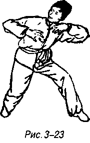 Из позиции для атаки швыряемой ладонью правая нога толкает землю, левая нога перешагивает влево, носок заворачивается внутрь, одновременно корпус уворачивается влево - вниз, смотреть вправо-вверх (рис. 3-23).