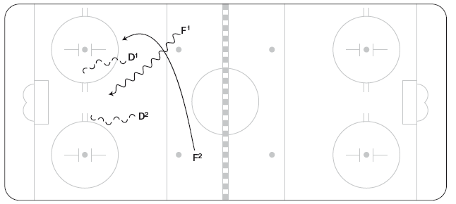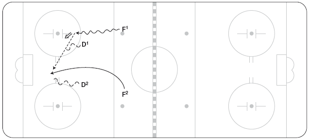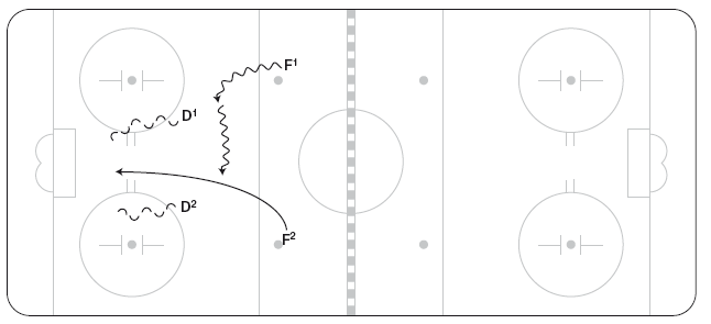 При использовании третьего варианта оба игрока совершают двойной проход. F1 может передать шайбу F2 позади защитника. F2 должен переместиться в эту точку со стороны обращенного внутрь площадки плеча обороняющегося защитника (D2) (рисунок 3.15). При выполнении двойного прохода F1 может принять решение о броске во время движения, тогда как F2 направляется к воротам на случай отскока.