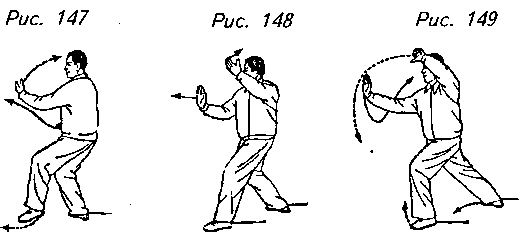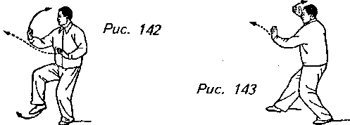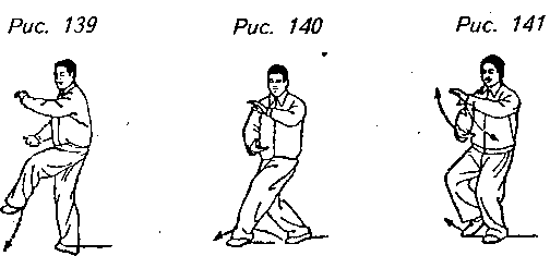 Движение 1 (продолжает рис. 138): Поверните корпус немного налево, левая стопа плотно опускается на землю, левый носок направлен в сторону, приподнимите правую пятку и перенесите вес тела на левую ногу. Выполнив это, переведите обе руки в положение человека, держащего мяч перед левым бедром, причем левая ладонь придерживает мяч сверху. Затем придвиньте правую стопу к внутренней стороне левой стопы, правый носок должен касаться земли. Взгляд направлен на левое предплечье (рис. 139, 140, 141).