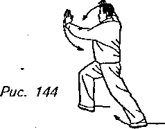 Движение 2: Сделайте правой ногой шаг вправо и медленно перенесите центр тяжести своего тела на нее, переходя на правый “шаг вдоль кромки радуги”. Одновременно с этим поднимите правую ладонь по округлой траектории, пересекающей лицо, чтобы пальцы оказались непосредственно перед лбом (как бы защищая его), причем ладонь должна быть обращена под углом кверху, а левая рука на уровне носа выталкивается вперед с ладонью, направленной наружу. Взгляд теперь должен быть обращен к левой ладони (рис. 142, 143, 144).