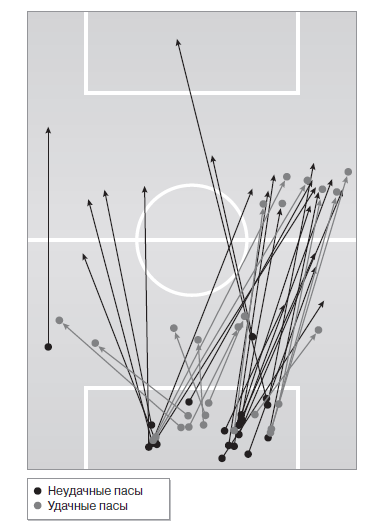 Возможно, много лет назад главный тренер мог спрятать своего худшего игрока, сделав его крайним защитником, но с развитием видеоанализа, обширной агентской деятельности и более интенсивным темпом игры кажется сомнительным, что команда сможет долго скрывать слабое звено. Посмотрим на «Арсенал», столкнувшийся с тем, что Гаэль Клиши, его левый защитник, находился в ужасной форме во второй половине сезона-2009/10. Когда он в конце января участвовал в матче на своем поле с «Манчестер юнайтед», в котором гости победили со счетом 3:1, его мучили скорость и сила Нани, португальского полузащитника гостей. И это не было случайностью: Майкл Кокс с посвященного тактике вебсайта Zonal Marking заметил, что голкипер «Юнайтед» Эдвин ван дер Сар направлял подавляющее большинство своих ударов от ворот в сторону зоны, оберегаемой Клиши (диаграмма 46)9.