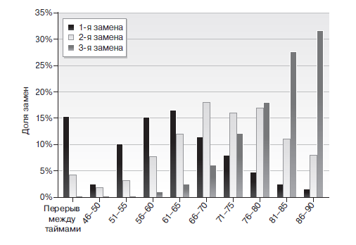 По словам Брета Майерса, когда-то известного игрока входящей в Объединенные футбольные лиги команды «Ричмонд Кикерс», а теперь профессора в области управления и руководства в Университете Вилланова, только небольшая часть замен происходит в первом тайме и очень мало происходит в первые шесть минут матча16. Его примеры матчей в Премьер-лиге, Ла Лиге и Серии А показывают, что большинство первых замен происходит во время перерыва между таймами и между пятьдесят шестой и шестьдесят пятой минутами матча. Большинство вторых замен происходят между шестьдесят шестой и восьмидесятой минутами, а третьи замены происходят в последние десять минут (плюс в случаях травм) матча (диаграмма 47).
