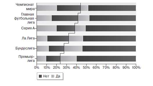 Этому правилу, кажется, следует не так много главных тренеров, как видно на диаграмме 48. Ступенчатая линия, идущая вниз по центру горизонтальных столбиков, отделяет те матчи, в которых главные тренеры следовали правилу, от тех, в которых они не следовали правилу. Кроме того, столбики расположены сверху вниз по частоте следования правилу. Большее количество главных тренеров придерживается принципа, который мы могли бы назвать < 58 < 73 < 79, в чемпионате мира и Главной футбольной лиге, чем в любой другой лиге, при этом главные тренеры в Премьер-лиге и Бундеслиге оказались самыми консервативными относительно замен. Примерно в 44 процентах национальных сборных в чемпионате мира проводились агрессивные замены, когда они отставали, в Премьер-лиге так поступали менее четверти проигрывающих команд.