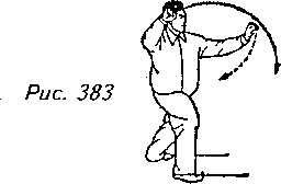 Движение 2: Немного поверните верхнюю часть тела влево. Одновременно с этим толкните левый кулак вперед и влево, не выше уровня плеча. Тыльная сторона кулака должна быть обращена под углом внутрь. Правый кулак передвиньте чуть позади левой руки к правой стороне лица, ближе к правому виску, держа также кулак тыльной стороной немного к себе. Кулаки должны оказаться направленными ямками между указательными и большими пальцами друг к другу, а обе руки образовать полуокружность, как будто вы натягиваете воображаемый лук и во что-то целитесь. Взгляд нужно направить на левый кулак (рис. 383).