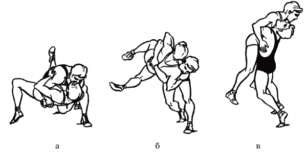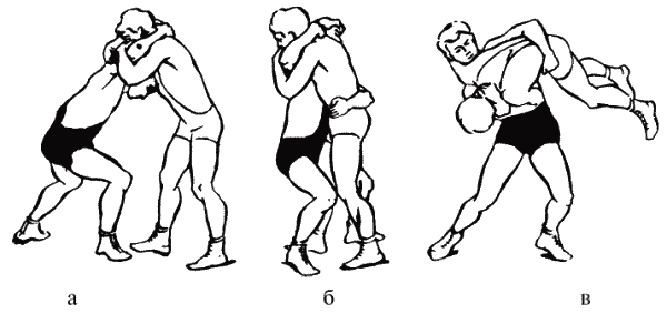 Для более успешного проведения таких бросков целесообразно провести захват туловища противника как можно ниже к его тазовому поясу (рис. 1.15).