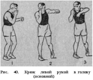 Удары сбоку левой (в боковой позиции) без шага вперед выполняют так: толчком носка левой ноги вес тела переносят на правую ногу, в тазобедренном суставе которой осуществляют вращение слева направо. Левую руку, сгибая ее в локтевом суставе под прямым углом, направляют кулаком к цели по кривой (отрезку окружности или параболы) сбоку. Кулак, предплечье и плечо бьющей руки направляют к цели в одной плоскости — горизонтальной или направленной несколько сверху вниз (верхний удар сбоку). Правой рукой (ладонью открытой перчатки) страхуют голову от возможных встречных ударов (рис. 40).