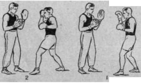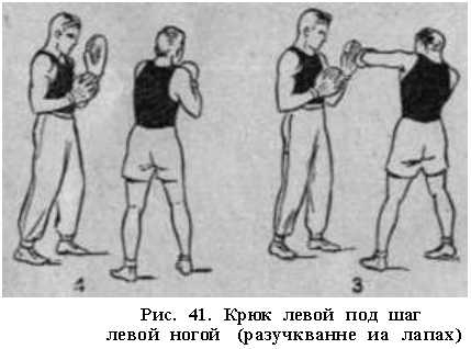 Удар сбоку левой с шагом вперед левой ногой отличается от удара на месте только тем, что движению удара предшествует шаг, а вращение в левом тазобедренном суставе боксер начинает в момент, когда подтягивает правую ногу к левой и ставит ее на место соответственно боевой нотации (рис. 41). Этот удар может быть атакующим в дальней дистанции, в особенности, если его подготовить предварительными финтами и маневрированием; удар можно также использовать в ближнем бою как самостоятельный или же в числа других ударов серии. Сделанный с акцентом удар сбоку левой может служить завершающим ударом в серии.
