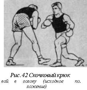 Скачковый крюк. Следующая разновидность удара сбоку левой связана с движением ног, которое мы называем скачком. Так как этот удар своеобразен и по технике резко отличается от других разновидностей удара левой сбоку, мы предлагаем для него термин «скачковый крюк» (рис. 42).