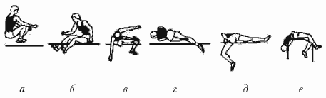 Первым этапом становления техники был прыжок с прямого разбега, поджав ноги (рис. 24, а). Он является наименее эффективным, поскольку преодолеваемая планка могла располагаться на 35–40 см ниже верхней точки траектории полета ОЦМТ прыгуна.