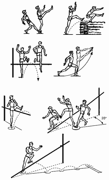 Рис. 28. Упражнения, способствующие овладению техникой прыжка в высоту способом «фосбери-флоп»
