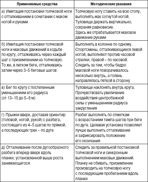 При разметке разбега, как правило, используются две контрольные отметки: одна в начале разбега, другая – в начале входа в дугу. Начало разбега может выполняться с места и с подхода. Во втором случае спортсмен может набрать небольшую скорость к контрольной отметке, а сам разбег начинается большими шагами с небольшим наклоном туловища вперед. На последних шагах разбега при беге по дуге происходит нарастание темпа бега, т. е. для повышения эффективности отталкивания прыгун в предтолчковой фазе разбега должен сделать ускорение на трех последних шагах.