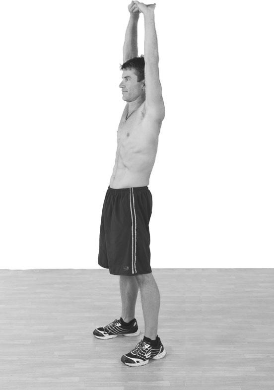 1. Встаньте прямо, ноги на ширине плеч, вытяните выключенные в локтях руки над головой, переплетите пальцы и поверните ладони вверх.