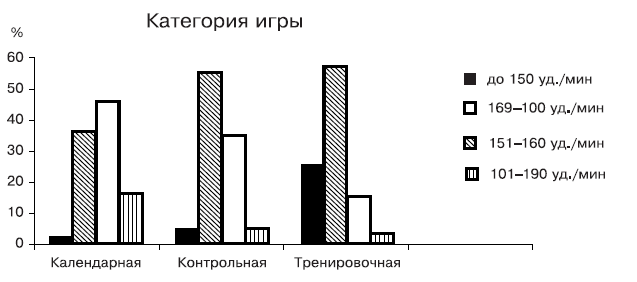 Рис. 118. Соотношение времени деятельности полевых игроков при разных режимах ЧСС в играх различной категории