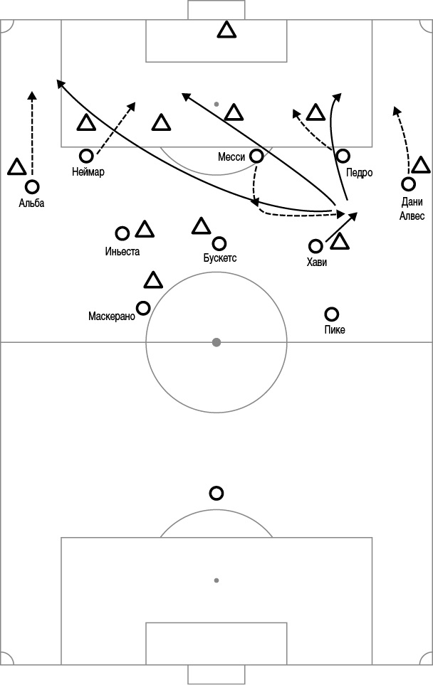 «Барселона» играет так: Месси отходит в полузащиту. Левые и правые вингеры и полузащитники идут за ним, а защитники отдают ему передачу и ждут от Месси разрезающего обратного паса. Защищаться в такой ситуации очень трудно. Любой защитник, идущий за Месси в середину поля, оставляет за собой огромную свободную зону, куда могут врываться другие игроки соперника. Таким образом, вы постоянно сталкиваетесь с дилеммами.