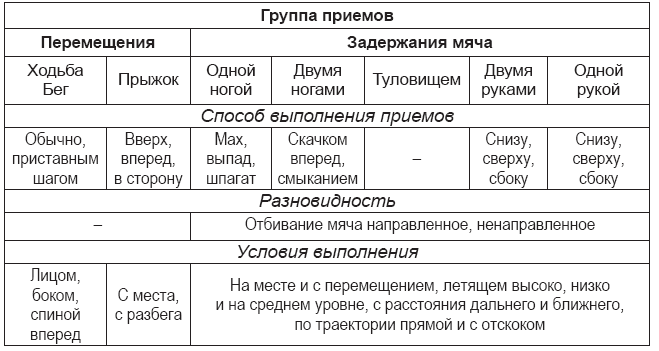 Не пропустить мяч в ворота и организовать контратаку – вот основные задачи игровой деятельности вратаря. Вся техника игры вратаря делится на технику защиты и технику нападения. Приемы техники гандбольного вратаря не похожи на игру вратаря в футболе, хоккее, водном поло. Его техника уникальна, она вобрала в себя все возможные движения (табл. 6).