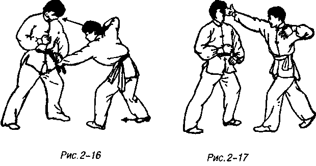 Когда противник пойдет вниз, то корпус поворачивается влево, одновременно правая ладонь с тыльной стороной в качестве точки приложения силы внезапно наносит швыряемый удар по глазам противника, следуя движению правая нога естественно подшагивает на полшага влево-вперед и ставится на землю передней частью подошвы, правое плечо подается вперед (рис. 2-17).