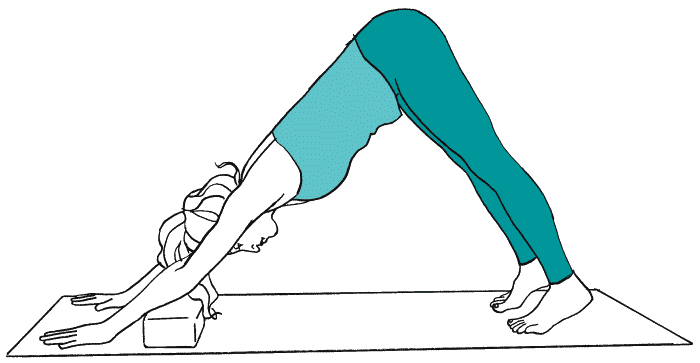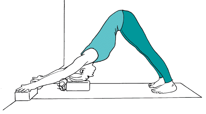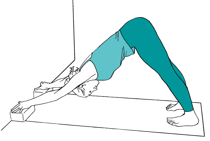 Положите коврик узкой стороной к стене, а сверху него – два блока на расстоянии ширины плеч друг от друга (блоки должны упираться в основание стены). Третий блок разместите по центру коврика – на нем будет располагаться ваша голова. Встаньте на четвереньки, поставьте руки на блоки и вытяните в стороны пальцы. Подверните носки и на выдохе оторвите колени от пола, подавая таз назад и вверх. Перенесите вес тела на ноги и вытягивайте корпус до тех пор, пока не почувствуете, как удлиняются мышцы внутренней поверхности рук, боковые ребра и подмышки. Затем, не сгибая руки в локтях, опустите голову на блок. Если она не достает до блока, поставьте блок на ребро или положите на него сложенную простыню.