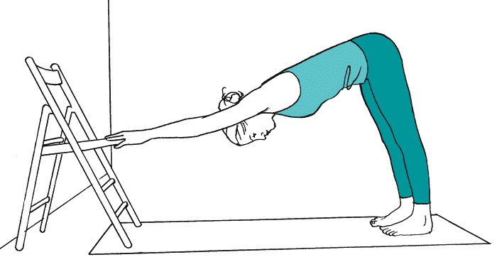Вариация с руками на стуле. При тугоподвижности плечевого пояса поза собаки мордой вниз представляет определенную сложность. Чтобы разработать плечевые суставы и развить силу рук, поработайте сначала с более высокой опорой (рисунок 7В). Разместите коврик узкой стороной к стене (на расстоянии примерно 30 сантиметров от ее основания) и поставьте на него стул. Вытяните пальцы рук, положите ладони на сиденье стула и переместите стопы к заднему краю коврика. Теперь вам нужно выстроить тело так, чтобы запястья, плечи и бедра находились на одной линии: не сгибая рук и ног, начните подавать корпус назад, от стула, пока не почувствуете, как растягиваются плечи, под мышки и грудная клетка. Чтобы выйти из асаны, сделайте шаг вперед и встаньте в позу горы.