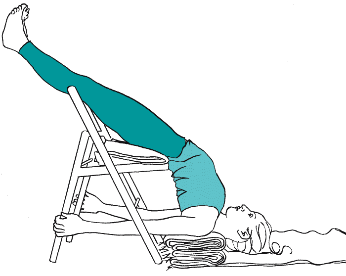Поставьте стул на расстоянии 50–60 сантиметров от стены, сидень ем внутрь комнаты. Положите у его основания сложенное одеяло (на нем будет располагаться голова), а сверху – впритык к передним ножкам стула – 2 узкосложенных одеяла, ровным краем к центру комнаты. Поместите на сиденье сложенный коврик (или 2, если у вас высокий рост). Сядьте на стул задом-наперед и свесьте ноги со спинки – так они будут создавать противовес, не давая стулу перевернуться. Держите ноги в таком положении до тех пор, пока не займете исходное положение и не организуете плечи и руки. Мягко опустите корпус вниз и уложите верхушки плеч (но не макушку головы) на стопку одеял, а затылок – на нижнее одеяло. Пропустите руки между передними ножками стула и возьмитесь за задние ножки.