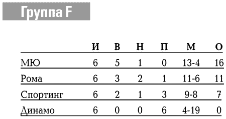 «МЮ»: группа — «Спортинг» Л — 1:0 г, 2:1 д, «Рома» — 1:0 д, 1:1 г, «Динамо» К — 4:2 г, 4:0 д, п/о — «Лион» — 1:1 г, 1:0 д, «Рома» — 2:0 г, 1:0 д, «Барселона» — 0:0 г, 1:0 д.