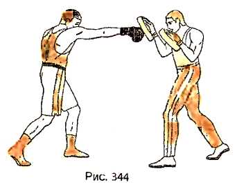 Находясь в боевой левосторонней стойке против лап на расстоянии чуть большем вытянутой руки до лапы, отталкиваемся правой ногой и, с шагом вперед, выполняем прямой удар правой рукой в правую лапу (рис. 342). Удар завершаем переносом веса тела на левую ногу. Возвращая правую руку после нанесения удара, одновременно отталкиваемся левой ногой и выполняем прямой удар левой рукой в левую лапу, перенося вес тела на правую ногу (рис. 343). Сразу же после нанесения этого удара партнер выдвигает правую лапу немного вперед. Возвращая левую руку к подбородку, отставляем правую ногу назад и, срывая правый кулак, наносим прямой удар правой рукой в правую лапу, с подтягиванием левой ноги к правой и переносом веса тела на левую ногу (рис. 344). После чего занимаем боевую стойку.