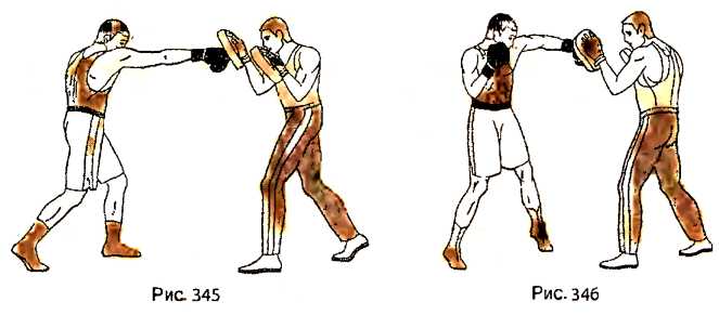 Находясь в боевой левосторонней стойке против лап на расстоянии чуть большем вытянутой руки до лапы, отталкиваемся правой ногой и, с шагом вперед, выполняем прямой удар правой рукой в правую лапу (рис. 345). Удар завершаем переносом веса тела на левую ногу. Возвращая правую руку после нанесения удара, одновременно отталкиваемся левой ногой и выполняем боковой удар левой рукой в левую лапу, перенося вес тела на правую ногу (рис. 346).