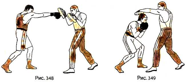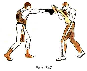 Находясь в боевой левосторонней стойке против лап на расстоянии чуть большем вытянутой руки до лапы, срываем правый кулак и, отталкиваясь правой ногой, делаем шаг левой ногой вперед, нанося прямой удар правой рукой. Удар в лапу на правой руке партнера наносим с постановкой левой ноги на пол, завершая его полным переносом веса тела на левую ногу (рис. 348).