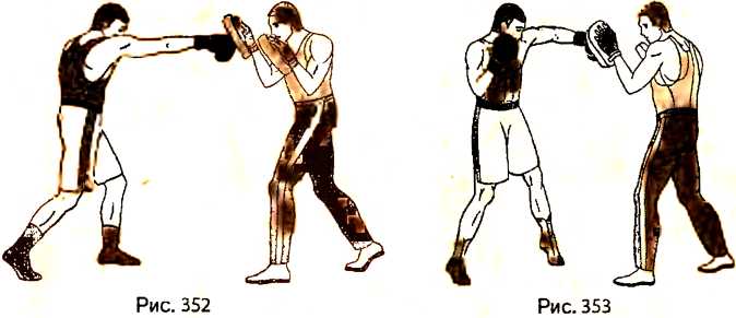 Возвращая правую руку после нанесения удара назад (партнер в это время имитирует боковой удар левой рукой в голову и делает шаг назад, слегка разворачивая правую лапу вовнутрь на 45 градусов ), выполняем нырок под левую, наносящую удар руку партнера (рис. 349) и делаем шаг правой ногой вперед и немного вправо, перенося вес тела на правую ногу. Следующим движением отталкиваемся правой ногой и, с постановкой левой ноги вперед на один шаг, наносим боковой удар правой рукой в правую лапу, перенося вес тела на левую ногу (рис. 350). Сразу же после нанесения второго удара, возвращая правый кулак к подбородку, наносим удар левой рукой снизу в левую лапу (рис. 351).