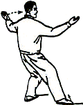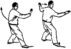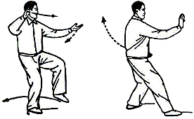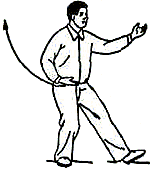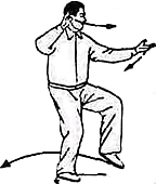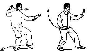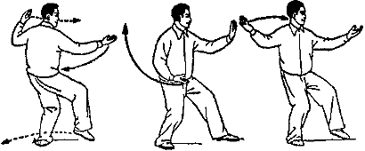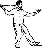 Обратить внимание: при выносе и возврате кисти двигаются по дугам, талия и бедра расслаблены. Повороты талии координируются с движениями кистей. При отступлении назад ставить на пол вначале носок, а затем всю стопу. Одновременно с поворотом тела разворачивать переднюю стопу носком вперед. В положении с разведенными в стороны руками носок передней стопы касается пола. При перемещении смотреть сначала на кисть, двигающуюся в направлении поворота, а затем переводить взгляд на другую. В конечном положении направление на 9 часов.
