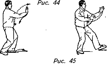 Движение (продолжает рис. 43): Переставьте правую ногу к левой пятке, приподнимите левую ногу и сделайте маленький шаг вперед, переходя на левый “свободный шаг”, при этом прикасайтесь пяткой к земле, а колено держите чуть-чуть согнутым. Центр тяжести должен быть перенесен на правую ногу. В соответствии с движениями ног полусогнутую левую руку следует поднять от левого бока до уровня носа, ладонь нужно направлять вправо; в это время вашу правую ладонь, направленную влево, надо перенести к локтю левой руки.