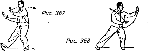 Движение 1 (продолжает рис. 366): Отклоните верхнюю часть корпуса назад, перенесите вес своего тела на левую ногу и поверните кончики ее пальцев направо внутрь. Сделав это, поверните верхнюю часть тела влево, проведите ладони (левая выше, чем правая) поперек груди влево до тех пор, пока левая рука не окажется на одном уровне по горизонтали с левым боком вашего тела, а правая рука (согнутая в локте) должна при этом оказаться прямо перед грудью. Взгляд теперь направлен на левую ладонь (рис. 367, 368).
