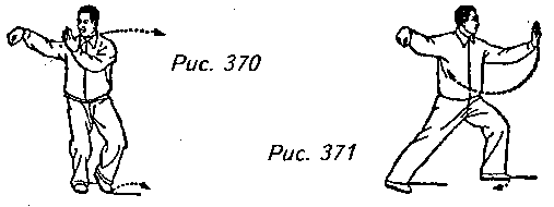 Движение 3: Немного поверните верхнюю часть корпуса влево, левой ногой сделайте шаг влево и перенесите на нее центр тяжести тела, переходя на левый “шаг вдоль кромки радуги”. Одновременно с этим поверните левую ладонь от себя и вытолкните ее влево, чтобы ее пальцы оказались на уровне глаз. Проследите за тем, чтобы руки были слегка согнуты, плечи опущены, а локти расслаблены. Взгляд по-прежнему направлен на левую руку (рис. 371).